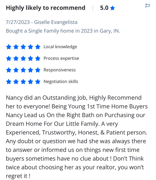 A member of the Valparaiso Chamber of commerce and Northwest ​Indiana influential woman's society and is a Sitting Board member for ​PCA Board of directors in Valparaiso, Member of Women United of ​NWI. Nancy also enjoys volunteer work in the community, Valparaiso ​chocolate walk, Thanksgiving 500 Turkeys for families in need and ​United Way. Nancy is a proud member of the Listing Leaders ​Brokerage, with over 600 agents in NWI and Chicago land. Two full ​time processors behind her team .Additionally, she holds ​membership within GNIAR, MLS, and NAR.